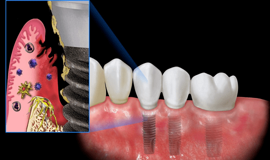 این عفونت در زمان جراحی یا بازیابی تاج دندان ممکن است بروز یابد. بهداشت ضعیف دهان و دندان نیز میتواند منجر به عفونت شود. در هر صورت بروز عفونت باعث تحلیل استخوان اطراف ایمپلنت و شکست درمان ایمپلنت میشود.